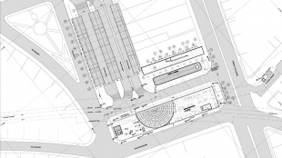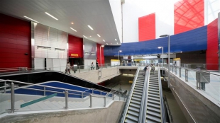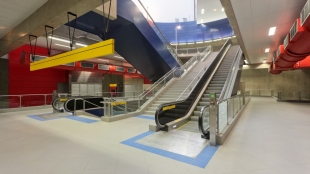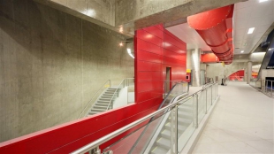 As áreas técnicas e salas operacionais desta estação estão contidas em uma edificação acima da superfície revestida por chapas de aço inox. As cores vivas utilizadas em toda a composição, aliadas a esta fachada metálica, destacam este equipamento urbano do entorno facilitando seu reconhecimento e localização.