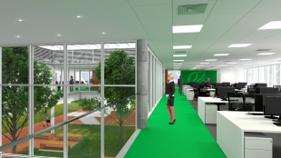 Como símbolo, o eucalipto nasce no coração do edifício a partir de um jardim interno, circundado pelos espaços de trabalho. As áreas de trabalho são ladeadas por elementos estruturais de fachada que também tem função de quebra-sóis. Dessa forma o edifício fica totalmente integrado com a natureza proporcionando um ambiente de trabalho saudável.